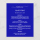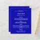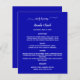 Um clássico cardápio de casamento. Um fundo azul real. Texto branco. Personalize e adicione seu nome, data e menu. Você pode adicionar mais texto, fotos no verso. 1 folha = 1 menu impresso borda a borda.