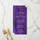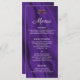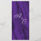 Um cardápio de na moda e roxo elegante para a recepção de casamento, com um padrão luxo e roxo de seda. Há um pequeno par de anéis de casamento de ouro no topo na frente do menu, e todos os detalhes podem ser personalizados para o fato. Na parte de trás do cartão está o mesmo design roxo, sedoso, com um par personalizado de monogramas de noiva que também podem ser personalizados para se adequarem.