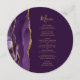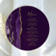 A borda esquerda deste elegante cardápio de casamento redondo moderno apresenta uma coloração d'água roxa, borda agitada com falso brilho dourado. O texto personalizável combina um script de escrita manual dourado e fontes de impressão em um fundo de ameixa rico. O verso apresenta um design de agate roxo e dourado correspondente.