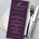 Cartão personalizado de cardápio de casamento. Simples design clássico e elegante em roxo para coordenar com as cores do seu casamento (procure na minha loja cores de alternativo ou clique em "personalizar mais" e mude a cor de fundo para o fato). O modelo está pronto para você adicionar os nomes da noiva e noiva, a data do casamento e o seu menu.