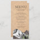 Cartão de cardápio rústico elegante com montanhas bonitas de neve e pinheiros com tipografia moderna contra um fundo Kraft.