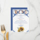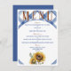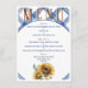 Um cardápio de casamento rústico e encantador que ajuda a atrair os seus convidados para curtir a sua recepção de casamento com um fundo azul e branco, girassóis e texto fácil de atualizar com as suas opções de menu pessoais.