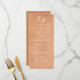 Este menu de casamento de na moda apresenta um fundo aquoso de cor de pêssego e argila com texto branco. Tem espaço para as iniciais do casal de dois ramos desenhados à mão. É o menu ideal para um casamento outono.