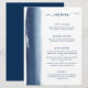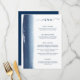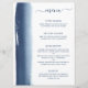 Cardápio de casamento moderno e criativo com um design simples com uma pincelada artística de aquarela azul marinho no lado esquerdo. No topo está o título, "cardápio" em uma fonte manuscrita com floreios e as descrições dos pratos em uma fonte sem serifa, sobre um fundo branco. O verso é uma tonalidade correspondente de azul marinho.