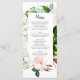 Orquídeas tropicais opulentas, magnólias, proteas rebeldes brancas e verde escura. A parte de trás do menu está verde-escuro.
