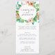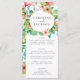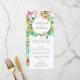 Este luxuoso cardápio tropical apresenta lindas flores aquáticas e folhas tropicais. A design floral tropical inclui flores de hibisco, flores de plumeria e folhas tropicais que circundam os nomes de casais felizes. Abaixo, personalize o modelo com os detalhes do menu do evento. A parte de trás do cardápio do casamento apresenta um lindo padrão floral tropical. A papelaria de casamento está disponível na nossa coleção de casamento Tropical Floral.