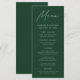 Elevem a sua recepção de casamento com o nosso belo cardápio de casamento, com um manuscrito elegante em um fundo verde-caçador. Perfeito para casais que buscam um olhar simples, mas sofisticado, este design moderno permite personalizar com seus nomes, data de casamento e ofertas de menus. Seu estilo minimalista complementa sem esforço qualquer tema de casamento, adicionando um toque de elegância ao seu dia especial. Faça uma impressão duradoura em seus convidados com um menu que reflita a simplicidade quica de sua visão de casamento.
