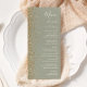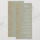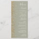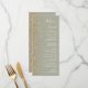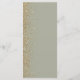 A borda esquerda deste menu de casamento moderno e elegante apresenta um design de brilho dourado falso. O texto personalizável combina escrita à mão em marfim, copperplate e fontes itálicas em um fundo verde sage. O verso apresenta um design correspondente em verde sage e brilho dourado.