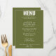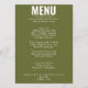 Um retro fedorento, moderno e brilhante menu de janto de casamento. Que apresenta modelo de chic de boho vintage fundo verde azeitona e tipografia branca e menu em negrito de branco. Perfeito e compatível com toda a suíte.