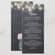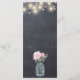 O menu de casamento leve de corda-chalkboard mostra peônias cor-de-rosa em um pote de mason.