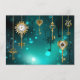 Chaves Douradas e antigas com engrenagens e marcadores penduram em correntes douradas sobre fundo verde luminoso.