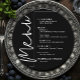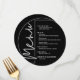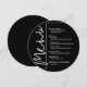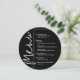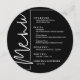 Um cardápio de jantar redondo preto e branco apresenta suas opções de menu em letras chiques, perfeito para um casamento moderno, jantar de ensaio de casamento, festa de aniversário ou qualquer evento especial com jantar sentado. Personalize facilmente com o seu cardápio e detalhes. MAIS cores em nossa loja.