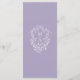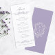 Elegant lavender floral border wedding menu with a floral crest and monograms on the back.