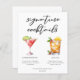 Esta ficha de cardápio de coquetéis de assinatura sofisticada apresenta uma tipografia negra simples acima de 2 das suas bebidas favoritas e seus ingredientes para o seu bar de casamento costeiro. Um desenho Cosmopolita Chic e Mai Tai adiciona um talento divertido ao seu menu de bar. Preencha com os nomes dos casais e a data para sua recepção.