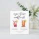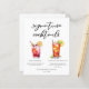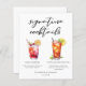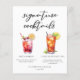 Esta folha de papel de cardápio de coquetéis de assinatura gráfica apresenta tipografia preta personalizada acima de 2 bebidas e seus ingredientes para seu bar de casamento. Um lindo Shirley Temple Sujo e um desenho de chá gelado de Long Island adiciona um talento legal ao menu do seu bar. Preencha com os nomes dos casais e a data para sua recepção.