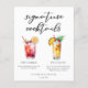 Esta folha de menus de coquetéis de assinatura eletrônica apresenta tipografia preta personalizada acima de 2 bebidas e seus ingredientes para seu bar de casamento. Um desenho bonito e sujo Shirley Temple e Piña Colada adiciona um talento legal ao menu do seu bar. Preencha com os nomes dos casais e a data para sua recepção.