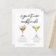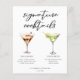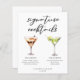 Esta lista de coquetéis de assinatura dele e dela mostra uma simples tipografia negra acima de 2 bebidas e seus ingredientes para seu bar de casamento. Um espresso martini e um clássico desenho martini adicionam um talento legal à sua folha de menus de bar. Preencha com os nomes dos casais e a data para sua recepção.