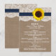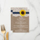 A coleção de girassol rústico é uma design impressionante que apresenta um adorável fundo de efeito de burvolta rústico com uma trim romântica de efeito de renda branca vintage, terminada com uma espinhante fita azul de girassol e marinho. Esses menus podem ser personalizados para sua ocasião especial e fariam a modelo perfeita para menus de casamento, menus de chá de panela, menus de festa de noivado, menus de festa de aniversário e muito, muito mais. *Note que o Zazzle só vende produtos impressos para que este item não tenha quaisquer materiais reais de burlap, rendas, girassol ou fita. EXIBIR ITENS CORRESPONDENTES PARA ESTA COLEÇÃO