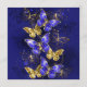 Composição de borboletas luxuosas de safira e joias de ouro em fundo azul texturizado.