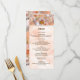 O cardápio do casamento com uma bela design com uma borboleta laranja tocando miçangas de pérolas brancas em forma de coração. Outra borboleta se mistura no buquê das rosas laranja-claro e rosa. Laranja é a cor do tema na imagem do papel pergaminho. Converta isso para qualquer ocasião. Adicione uma foto e/ou altere o texto. Personalize isso com suas informações.