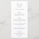 Menu de casamento tradicional e clássico preto e branco com uma crista de casamento com seu monograma dentro de uma coroa juntamente com os títulos em uma escrita / caligrafia. Estes menus de casamento simples, porém elegantes são ótimos para um casamento formal.