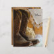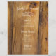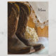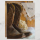 Personalize o Menu de Casamento Ocidental Rústico do Country Boots and Lace com os detalhes da refeição que você servirá no seu almoço de chá de panela casual mas clássico do celeiro, janto de recepção do casamento estilo fazenda ou poste o brunch de casamento adicionando a salada ou o primeiro curso, a entrada ou o segundo curso e a sobremesa ou o terceiro curso. Personalize-o com os nomes da noiva e do noivo, localização do local e data do evento. Este encantador menu de casamento personalizado de rancho apresenta uma fotografia tênue de um par de botas de cowboy ocidentais de couro, flor seca de flor de hydrangea, véu branco-brida e vintage, lenço branco aparado com lenço de linho com um fundo de madeira de cascata castanha.