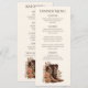 Elevem sua recepção de casamento com esses elegantes cartões de menu de dois lados, projetados para complementar seu tema ocidental moderno. Apresentando flores bordadas neutras e botas charmosas de cowboy, eles misturam charme rústico com elegância de eterno. Um lado mostra um menu de janto cuidadosamente organizado, enquanto o outro destaca a seleção do bar, garantindo que os convidados desfrutem de todas as partes da celebração. Impressos no estoque de cardais texturizado premium, esses menus adicionam um na moda e um toque polido ao seu dia especial.
