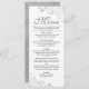 Este belo menu irá adicionar algum estilo à sua recepção de casamento. Ele apresenta um belo design com ornamentado de cinza prateado, caramujos e espirais em um fundo branco clássico. Há espaço para os nomes do casal e da data do casamento, e o texto é totalmente personalizável. Elegante, elegante, e glam, este menu irá adicionar um ar de sofisticação e graça à sua celebração.