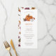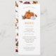Menu de Ação de Graças Abóbora. Este lindo e elegante menu de jantar de Ação de Graças de outono apresenta belas abóboras laranja queimada e brancas em aquarela e flores de outono com um padrão caprichoso no verso.