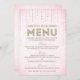 Este adorável cartão de menu design do The Spotted Olive™ apresenta um bonito fundo rosa pálido com uma imagem de gems cintilantes a partir do topo e a palavra "Menu" estilmente digitada com a palavra "Menu" preenchida com uma imagem de brilho dourado. NOTA: ESTE DESIGN APENAS APRESENTA UMA IMAGEM IMPRESSA DO GLITTER; NÃO HÁ NENHUM GLITTER FÍSICO USADO OU INCLUÍDO; NÃO HÁ EMBELÉDIOS.