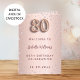 Um fundo gradiente em dourado-rosa falso com diamantes cor-de-rosa. O nome é escrito com uma fonte moderna de letras à mão em dourado-rosa escuro. O número 80 é escrito com uma fonte estilo balão, cursiva. Texto de boas-vindas, foto, cardápio e um agradecimento no verso.