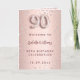 Um fundo gradiente em dourado rosa falso com diamantes rosa. O nome é escrito com uma fonte moderna de letra à mão colorida em dourado rosa escuro. O número 90 é escrito com uma fonte estilo balão, cursiva. Texto de boas-vindas, foto, cardápio e um agradecimento no verso.
