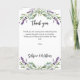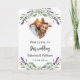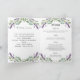 Texto de boas-vindas, foto, programa, menu e uma nota de agradecimento no verso. Decorado com flores lavandas e eucalipto verde. Talvez seja necessário ajustar o texto do menu e os nomes no verso, dependendo do texto necessário.