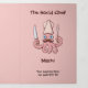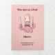 Cartoon de chef rosa com bigode segurando faca e garfo de cozinhar. Cor de fundo personalizada. Texto personalizado.