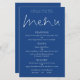 Menu de Casamento Azul Branco do Script Na moda de Orçamento. Um tamanho de preço orçamentário de 5,5" x 8,5",Um design tipográfico elegante em azul de médio com tipografia branca e um script na moda para o Menu de cabeçalho. Personalize facilmente o resto do texto para seus próprios detalhes, o que inclui espaço para suas opções vegetarianas ou vegetarianas. Você também pode alterar estilos e cores de texto, bem como as cores de fundo, por meio da opção personalizar mais, se desejar.