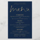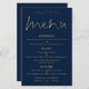 Menu de Casamento Azul do Marinho Dourado de Script Elegante de Orçamento. Um tamanho de preço orçamentário de 5,5" x 8,5", um elegante design tipográfico em ouro e branco, com um script de conjunto de na moda para o Menu do cabeçalho. Personalize facilmente o resto do texto para seus próprios detalhes, o que inclui alternativos para suas opções vegetarianas ou vegetarianas. Você também pode alterar estilos e cores de texto, bem como as cores de fundo, por meio da opção personalizar mais, se desejar.