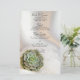 Personalize o bonito Menu de Casamento Verde em Branco com os detalhes da refeição que você servirá na sua festa de jardim no almoço de chá de panela, poste o brunch de casamento ou o janto de recepção de casamentos, adicionando a salada ou o primeiro curso, a entrada ou o segundo curso e a sobremesa ou o terceiro curso. Personalize-o com os nomes da noiva e noiva, local de evento e data. Este elegante menu de casamento natural personalizado apresenta uma fotografia floral pintada digitalmente de uma planta suculenta verde com um véu branco e fundo branco de cebola.