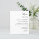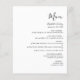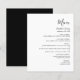 Este menu de casamento simples e moderno apresenta texto preto sobre fundo branco. A palavra "Menu" aparece na caligrafia na moda. Adicione o nome do casal e a data do casamento em script e itálico, juntamente com os detalhes do menu na fonte sans serif. O reverso é preto sólido.
