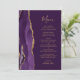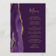 A borda esquerda deste elegante cardápio moderno de casamento apresenta uma cor d'água roxa, borda agitada com falso brilho dourado. O texto personalizável combina um script de escrita manual dourado e fontes de impressão em um fundo de ameixa rico. O verso apresenta um design de agate roxo e dourado correspondente.