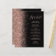A borda esquerda deste elegante cardápio moderno de casamento apresenta uma rosa dourada falso borda brilhante. O título personalizável e o texto combinam o script de escrita manual branco-rosa cor-de-rosa e as fontes em um plano de fundo preto. O verso apresenta um design brilhante rosa e preto correspondente.