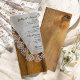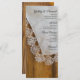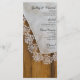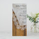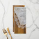 Personalize o Menu de Casamento de Chic Country Lace Barn com os detalhes da refeição que você servirá no seu janto de ensaio de casamento, almoço de chá de panela ou recepção de casamento adicionando a salada ou primeiro curso, entrada ou segundo curso e sobremesa ou terceiro curso. Personalize-o com os nomes da noiva e do noivo, localização do local e data do evento. Este charmoso carinhoso cardápio de casamento rústico mostra uma fotografia escura de uma vintage de lenço branco coberto de renda delicada e madeira de celeiro marrom de penas. Perfeito para o casal que planejou uma fazenda rural casual, mas clássica, ou tema de casamento no oeste.