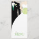 Noiva gráfica elegante com véu e segurando um poste de rosas verdes estilizados ao lado de seu noivo em um colete verde e um cardápio de casamento de gravata de arco preto. Edite esses menus com suas próprias opções de refeição. Outros itens correspondentes disponíveis. Design e arte gráfica únicas por Sarah Trett para www.mylittleedenweddings.com