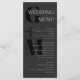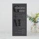Menu de casamento de tipografia elegante em cinzas muito escuras com suas iniciais em letras grandes ao lado do menu. Adicione seu menu em cinzas prateadas. Monograma de casamento em cinzas escuras com suas iniciais em preto. Menu de casamento tipográfico em preto e cinza. Menu de casamento monocromático e masculino em um design de tipografia limpo personalizado com suas iniciais.