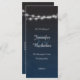 Um elegante modelo de cardápio de Recepção de casamento moderno em um efeito marinho azul de aquarela com pinceladas esmagadoras. No topo do menu estão duas cordas de luzes cintilantes com o fundo servindo como um céu noturno falso.