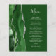 A borda esquerda deste elegante cardápio moderno de casamento mostra um caçador de aquarela verde agata bordada com falso brilho prateado. O texto personalizável combina a escrita manual e as fontes de impressão em cinza prateada em um fundo verde. O verso apresenta um design verde e prateado correspondentes.