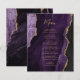 Este elegante cardápio moderno de casamento apresenta uma cor d'água púrpura e borda agitada com brilho de ouro falso. O texto personalizável combina o script de escrita manual dourada e as fontes de impressão em papel. O verso apresenta um design de agate roxo e dourado correspondente.
