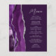 A borda esquerda deste elegante cardápio moderno de casamento apresenta um design de agata roxo, cor d'água, aparado com falso brilho prateado. O texto personalizável combina o script de escrita manual de cinzas prateadas e as fontes sans serif em um fundo de ameixa. O design de agato roxo e prateado é repetido no verso.