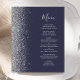 A borda esquerda deste elegante menu de casamento moderno apresenta uma borda cintilante de prata. O texto personalizável combina o script de escrita manual de cinzas prateadas e as fontes em um fundo azul escuro. O verso apresenta um design azul e prateado correspondentes.
