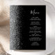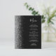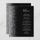 A borda esquerda deste elegante menu de casamento moderno apresenta uma borda cintilante de prata. O texto personalizável combina o script de escrita manual de cinzas prateadas e as fontes de impressão em fundo preto. O verso apresenta um design preto e prateado correspondente.