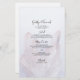 Personalize o elegante Menu de Casamento de Cristais Púrpuros de Lavanda Luz com os detalhes da refeição que você servirá no almoço de chá de panela, poste o brunch de casamento ou o janto de recepção de casamentos, adicionando a salada ou o primeiro curso, a entrada ou o segundo curso e a sobremesa ou o terceiro curso. Personalize-o com os nomes da noiva e noiva, local de evento e data. Este clássico menu de casamento do tema etéreo chakra personalizado apresenta uma fotografia de perto de uma amostra de geode mineral druz de quartzo branco com uma tonalidade púrpura pálida adicionada e um fundo branco. O quartzo claro também é conhecido como o "curandeiro mestre" e "pedra do poder" e é dito que amplifica qualquer energia ou intenção e faz um aprimoramento ou adição únicos à sua decoração de casamento.